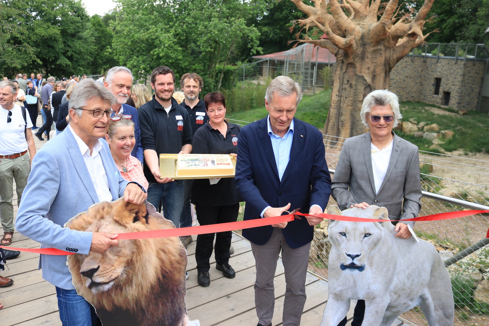 Voller Interesse schauten die Löwen Nakuru, Shaba, Kipangi, Mahiri und Amani heute auf die besondere Besucherschar im Anzug vor ihrem Gehege. Etwa 80 Gäste hatten sich coronakonform versammelt, um die Fertigstellung des neuen Zuhauses zu feiern. Dr. E.h. Fritz Brickwedde begrüßte die Anwesenden in seiner Funktion als Vorsitzender des Fördervereins „Löwen für Löwen“, der seit seiner Gründung 2016 Spenden für den Umbau sammelte: „Es ist vollbracht: Unser Löwenrudel hat ein größeres und schöneres Zuhause, sodass nun auch wieder Nachwuchs möglich wäre. Und einen großen Anteil daran hat unser Verein, der insgesamt fast 500.000 Euro gesammelt hat. Mit Open-Air-Kino, Löwenmahlzeit oder Auktionen sowie vielen Spendenaktionen haben wir das gemeinsam geschafft. Vielen Dank an alle großen und kleinen Löwenfans.“ Als Ehrengast war Christian Wulff, Bundespräsident a.D. und Gründungsmitglied des Vereins, vor Ort und hielt die Eröffnungsrede. „Ich begleite den Zoo schon seit einiger Zeit, als Osnabrücker, als Vater, als Politiker und ich bin immer wieder begeistert, dass dieser Ort durch die vielen Umbaumaßnahmen immer schöner wird und dass der Zoo dies auch noch mit sehr viel Eigenverantwortung schafft. Auch die Corona-Zeit hat der Zoo mit viel Kreativität und Elan gemeistert“, freut sich Wulff. „Gleichzeitig sind Zoos so wichtige Orte – generell, um Menschen für Arten- und Naturschutz zu begeistern, und gerade jetzt in dieser Corona-Zeit, um Familien und Kindern einen Ausgleich zu all den Strapazen zu geben. Toll, dass die Osnabrücker diesen wundervollen Ort direkt vor der Haustür haben und ihn auch so sehr schätzen, dass sie ihn mit vielen Spenden in dieser schwierigen Zeit unterstützt haben.“